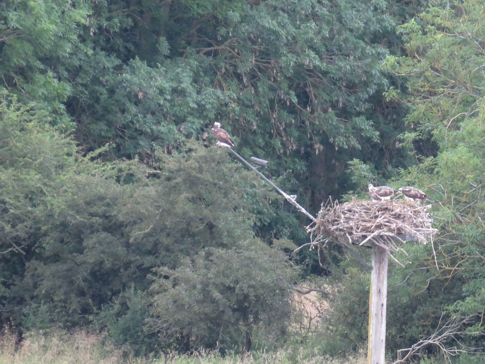 Following recent visits to nearby Rutland Water and especially two days ago with my friend Bryan Stapely on Wednesday 10 July, I managed to gather sufficient information to give an update on this year's Osprey breeding season.  The original nesting site in Manton Bay is still being used and this year's pair appear not only to have produced four eggs but all have successfully hatched and the chicks fledged.  Ringing of the chicks took place a couple of weeks ago when the birds were about 5 to 6 weeks old and the wardens were able to confirm that there were two males and two females.  However, whilst three are now free-flying, the smallest at about six days younger than the third chick, is yet to leave the nest platform but, on the other hand, may have now done so since last Wednesday's visit.